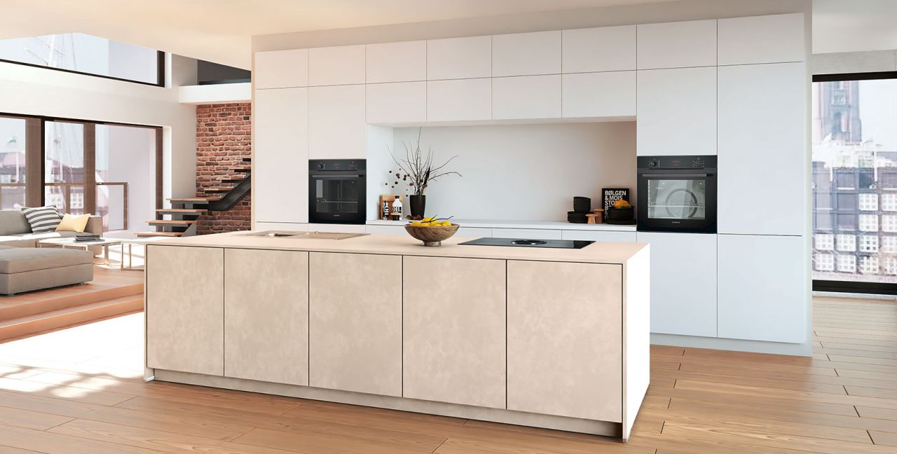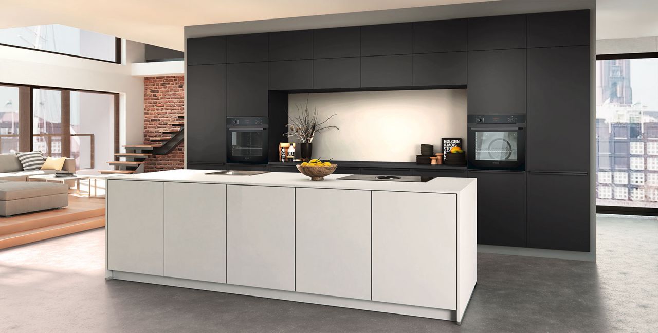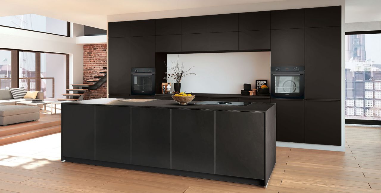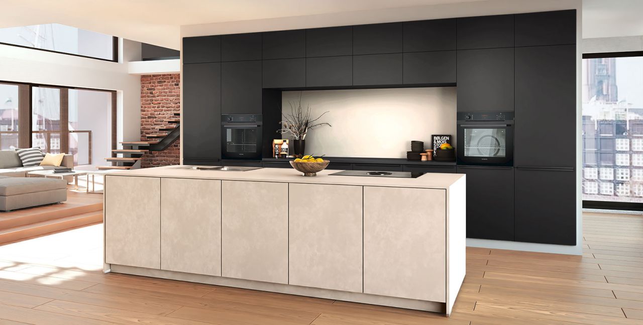 Inklusive 2x Einbaubackofen schwarz Siemens HB234ABB3 Energieeffizienzklasse A+, Glaskeramik Kochfeld mit Induktion und Kochfeldabzug (Umluft) Bora GPNextE80N, Kühlschrank Laurus LKG88E Energieeffizienzklasse E, Einbauspüle Edelstahl Rodi NewManaus, Wandschränken mit Klappe, XL-Schränken.