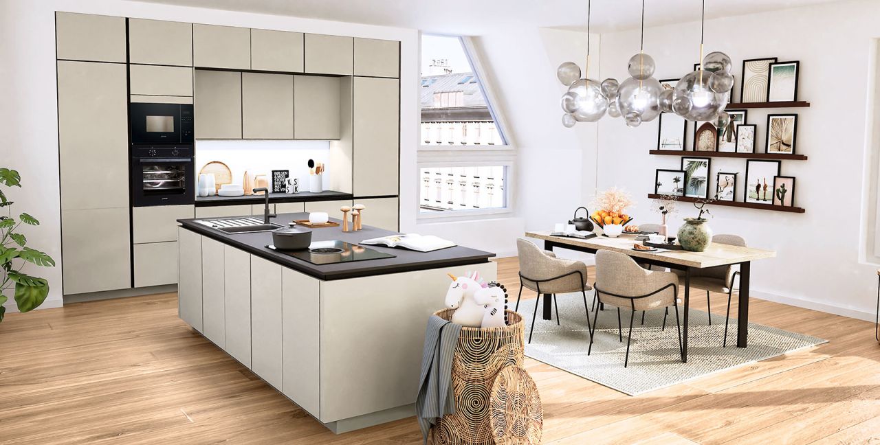 Inklusive Einbaubackofen schwarz Siemens HB234ABB3 Energieeffizienzklasse A+, Glaskeramik Kochfeld mit Induktion und Kochfeldabzug (Umluft) Bora GP4U, Kühlschrank Laurus LKS88E Energieeffizienzklasse E, Mikrowelle Junker JP4119260, Einbau-Designspüle Elleci Logik 300, XL-Schränken, Unterschrank mit Großraumauszügen, Wandschränken mit Klappe.