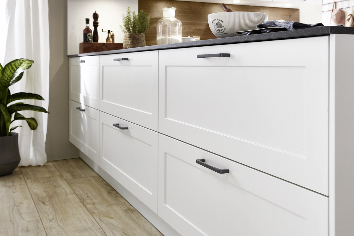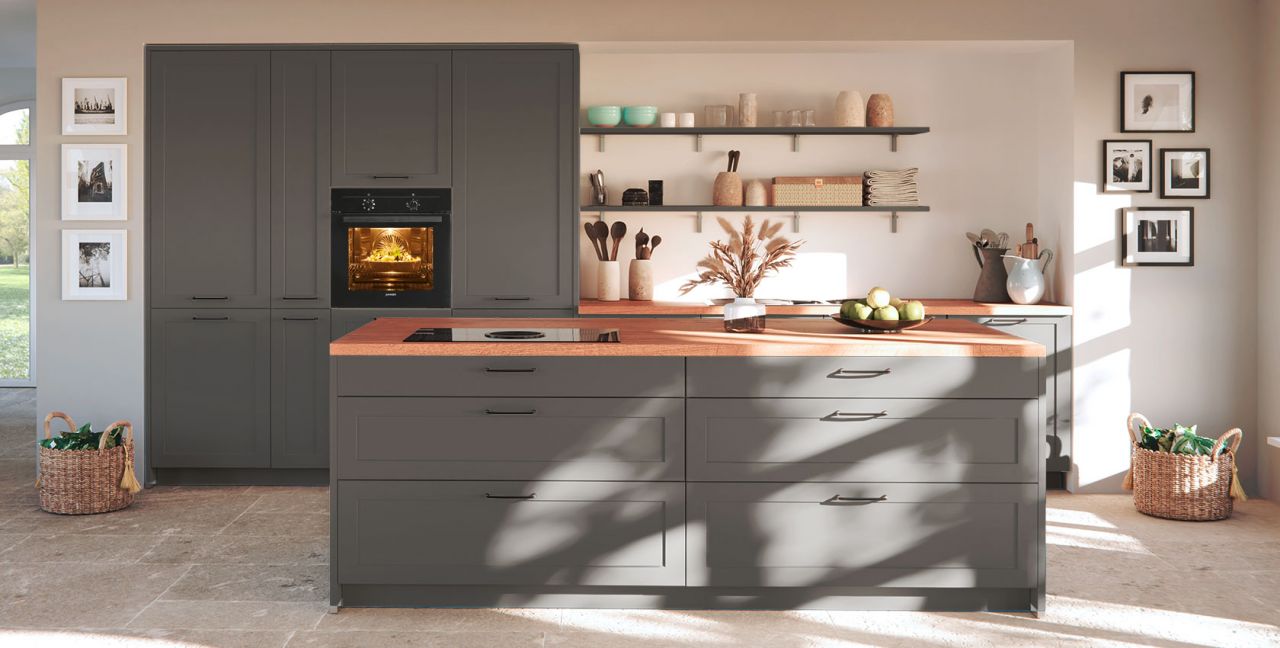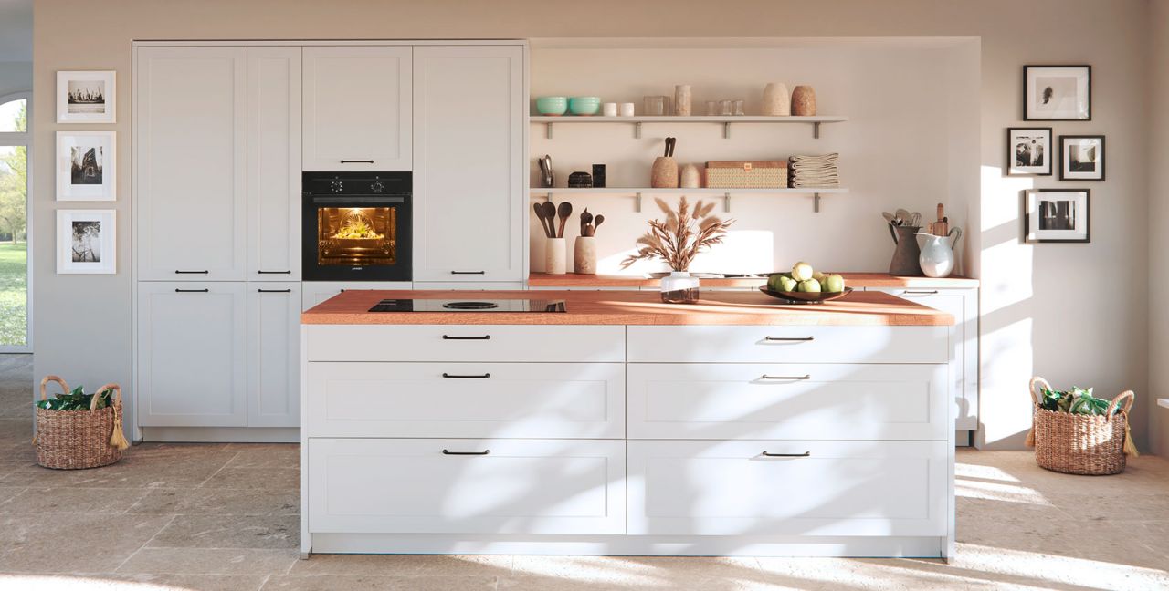 Inklusive Einbaubackofen schwarz Junker JF1300061 Energieeffizienzklasse A, Glaskeramik Kochfeld mit Induktion und Kochfeldabzug (Umluft) Bora GPNextE80N, Kühlschrank Laurus LKG88E Energieeffizienzklasse E, Einbauspüle Edelstahl Rodi Okio Line 85 Deep, XL-Schränken, Unterschränken mit Frontauszügen, Wandborden.