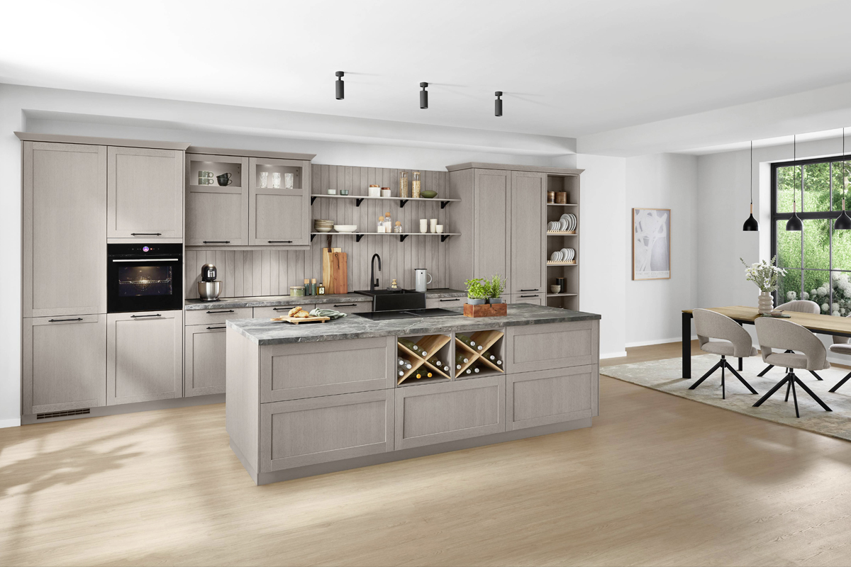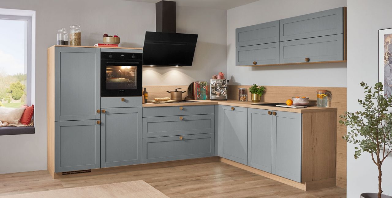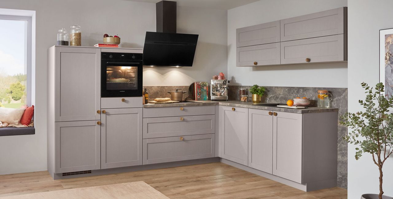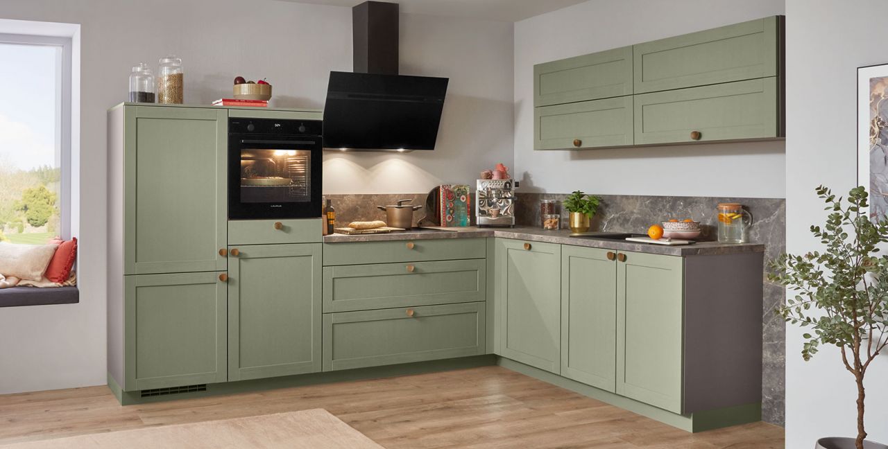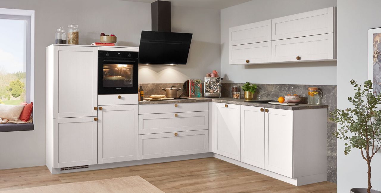 Inklusive Einbaubackofen Laurus LEB10BK Energieeffizienzklasse A, Glaskeramik Kochfeld Laurus LCA600, Designesse Schwarzglas Elica STRIPE90BK Energieeffizienzklasse B, Kühlschrank Laurus LKG88E Energieeffizienzklasse E, Einbau-Designspüle Franke Sirius S2D611-62, XL-Schränken, Unterschrank mit Frontauszügen, Wandschränken mit Falt-Lifttür.