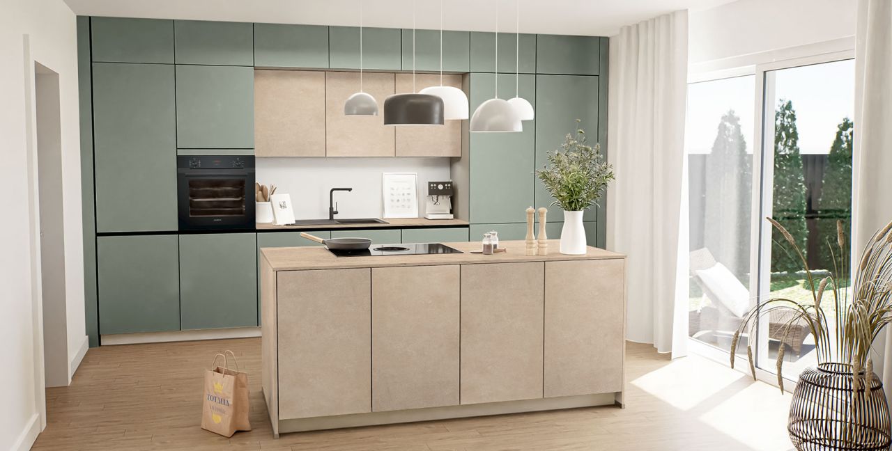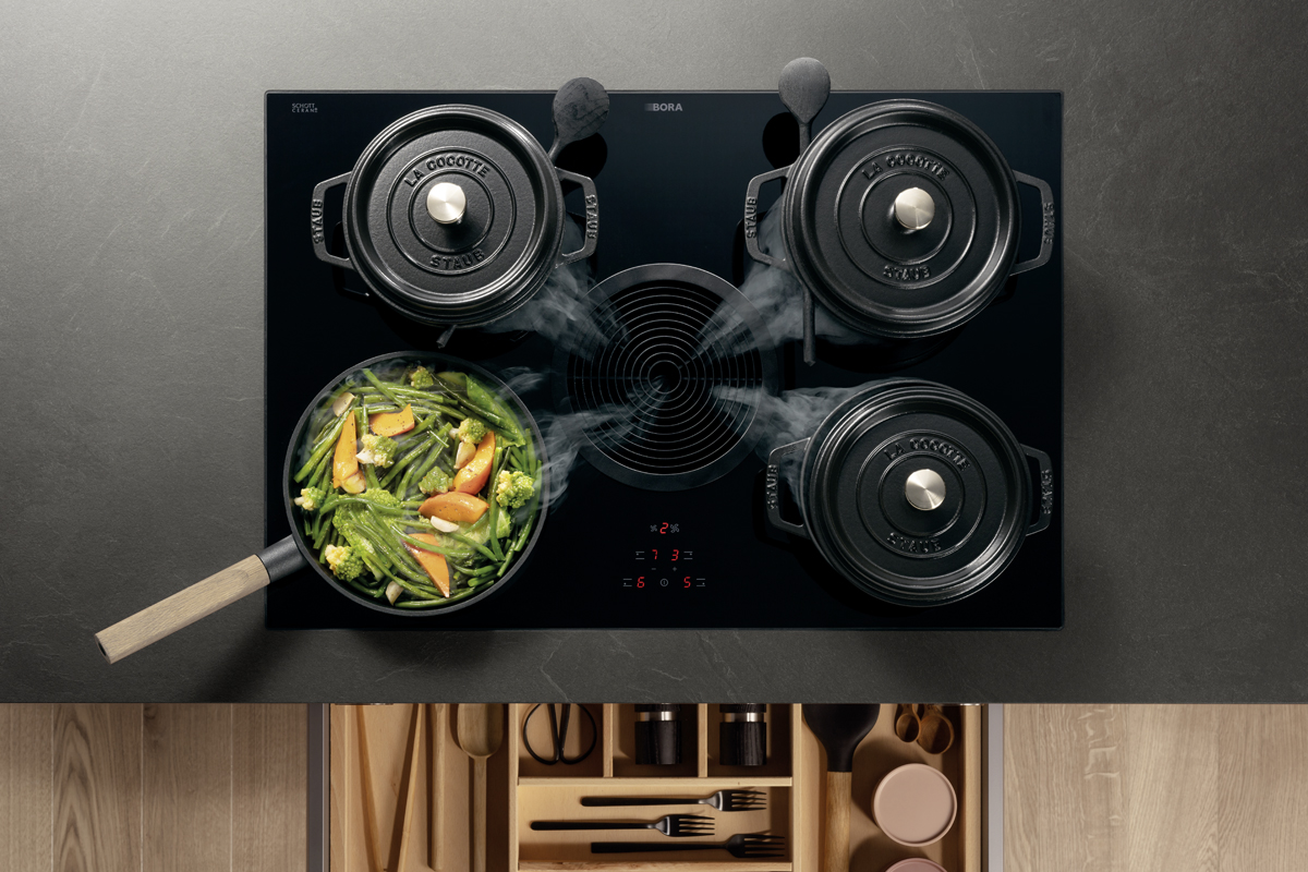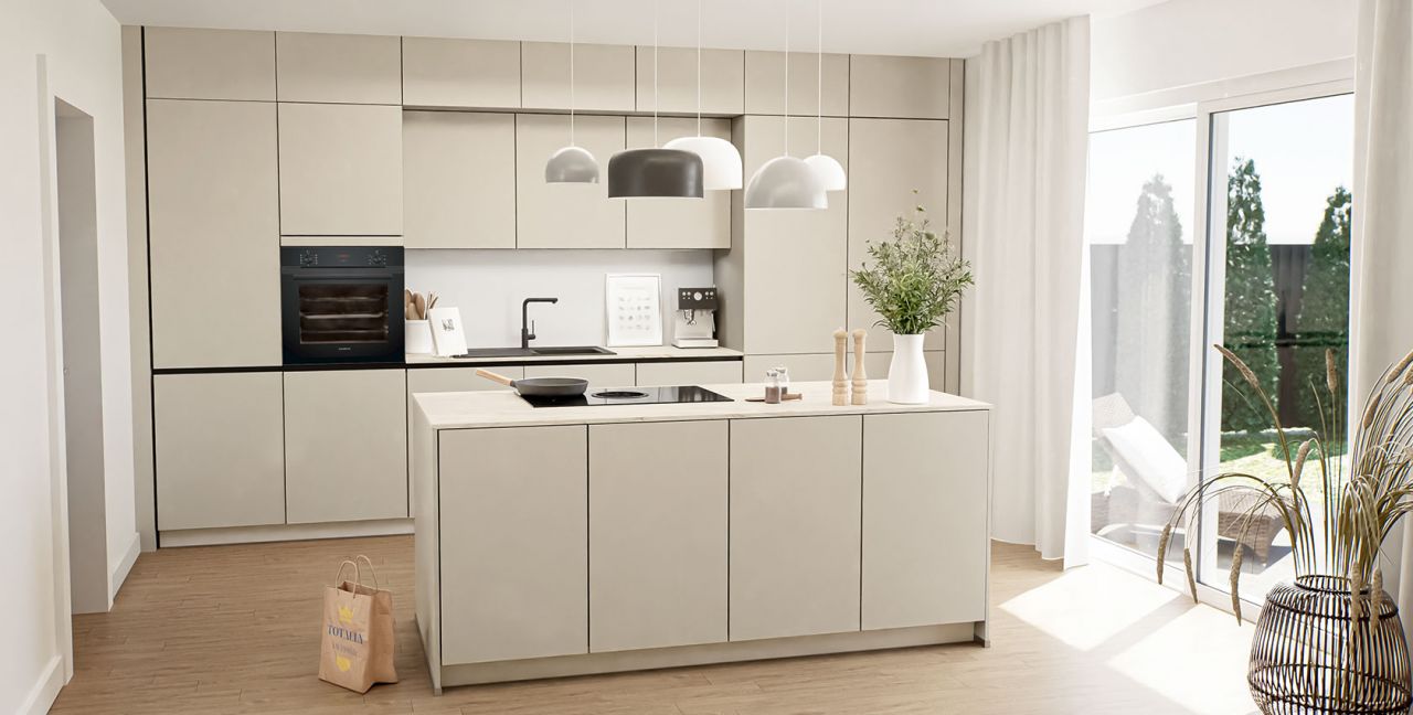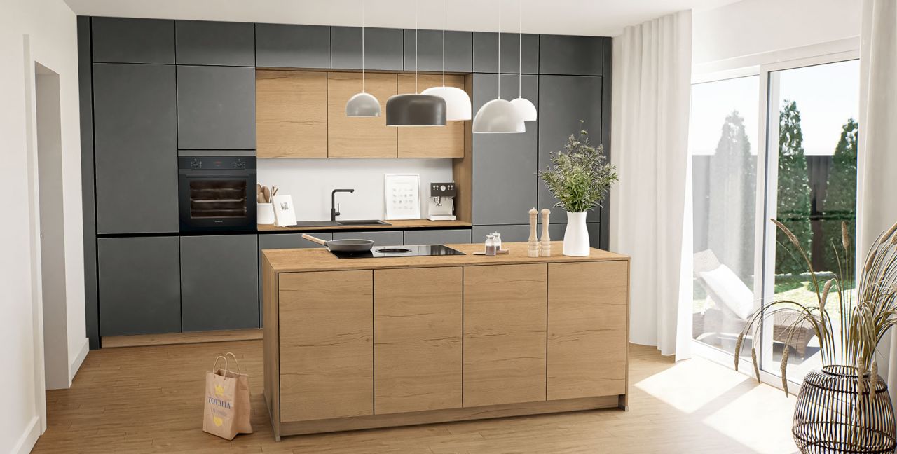 Inklusive Einbaubackofen schwarz Siemens HB234ABB3 Energieeffizienzklasse A+, Glaskeramik Kochfeld mit Induktion und Kochfeldabzug (Umluft) Bora GP4U, Kühlschrank Laurus LKG88E Energieeffizienzklasse E, Einbau-Designspüle Elleci Logik 300, XL-Schränken, Wandschränken mit Klappe.