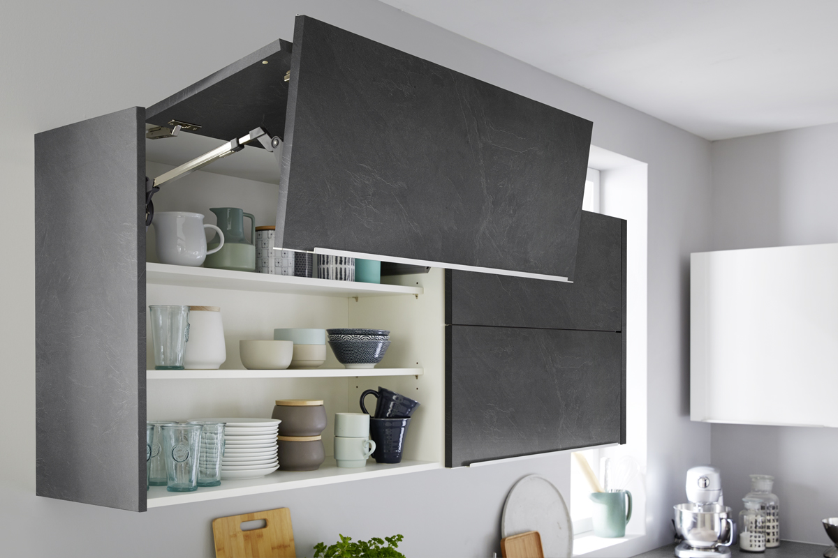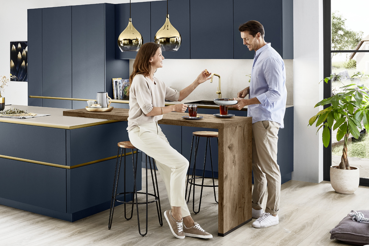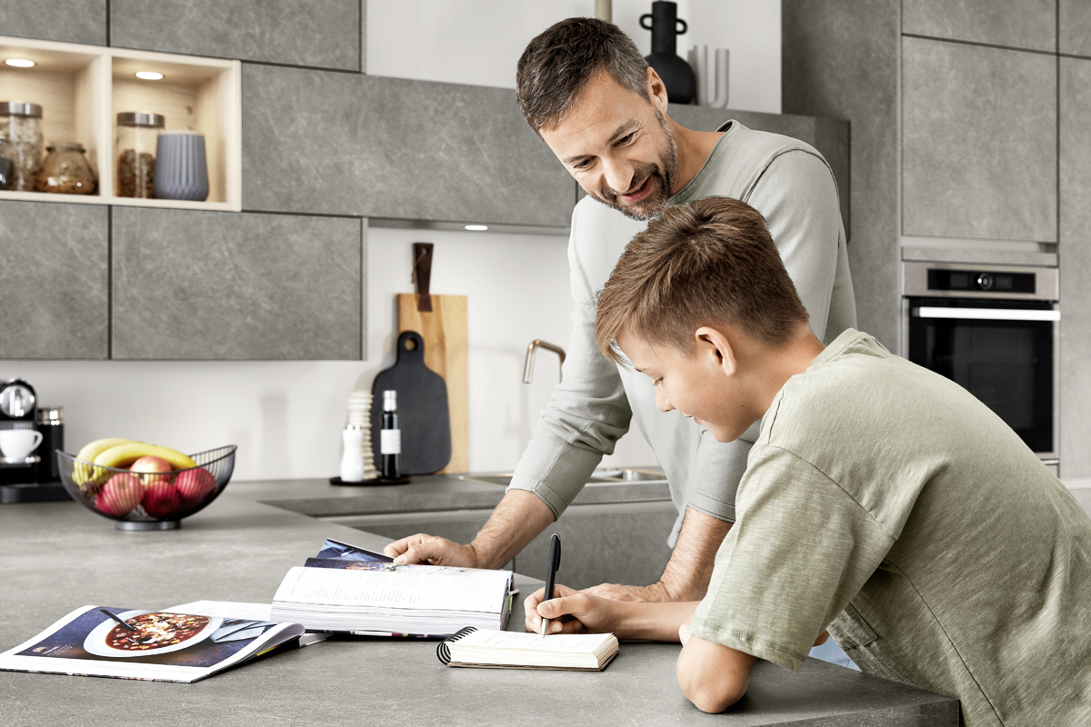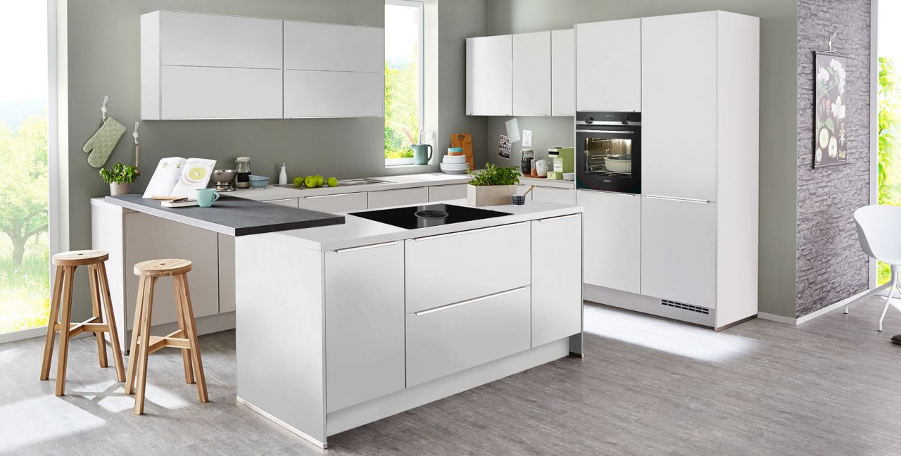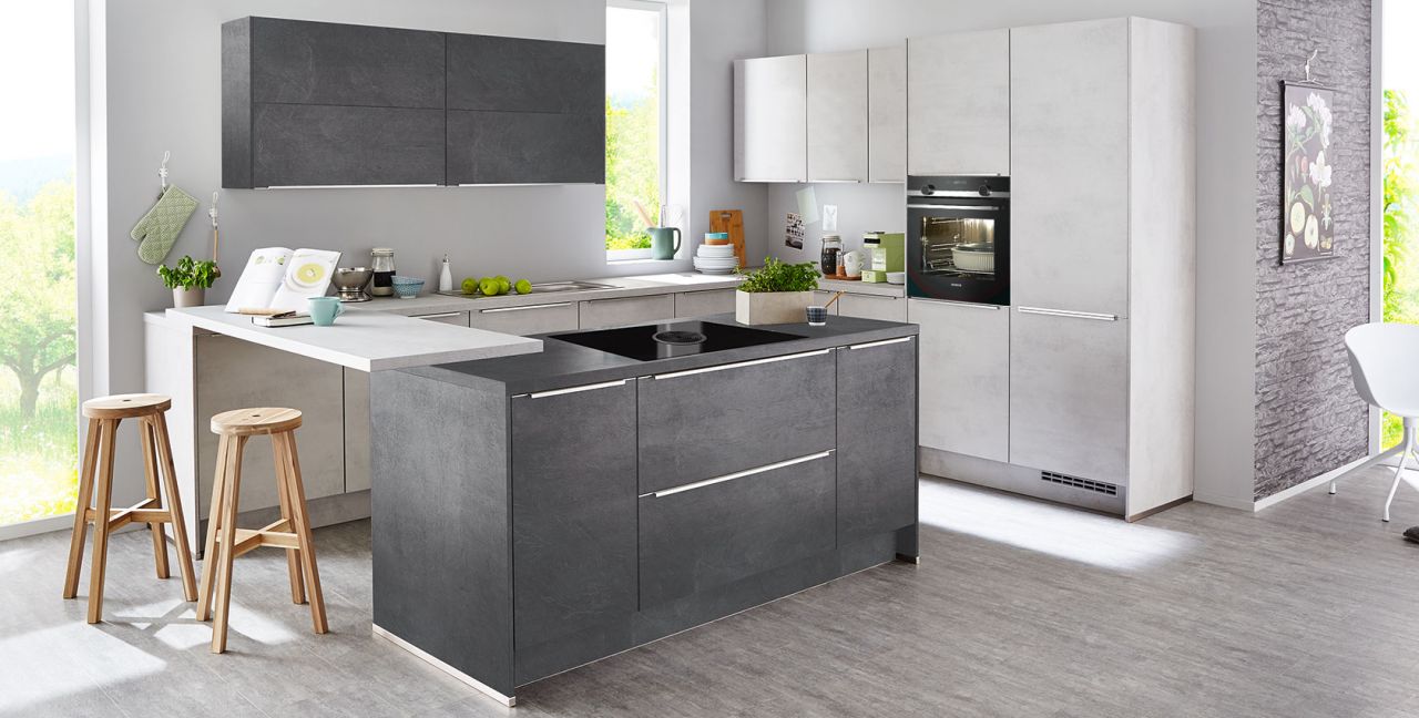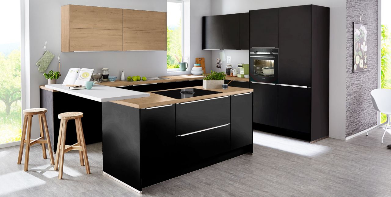 Inklusive Einbaubackofen in Schwarz / Edelstahl Siemens HB517GBS3 Energieeffizienzklasse A+, Glaskeramik Kochfeld mit Induktion und Kochfeldabzug (Umluft) Bora GPNextE80N, Kühlschrank Progress PK0814 Energieeffizienzklasse E, Einbauspüle Edelstahl Rodi Okio Line 85 Deep, Unterschrank mit Großraumauszügen, Wandschränken mit Falt-Lifttür, Esstheke.